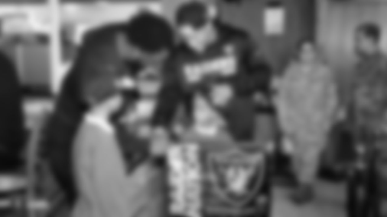 Raiders linebacker Kyle Wilber (58) visits U.S. servicemen and women at Royal Air Force Mildenhall.