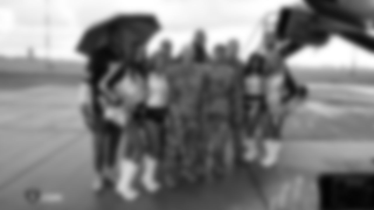 Raiderettes Rachel, Shaniah, Illora, Summer, Raiders long snapper Trent Sieg (47), fullback Alec Ingold (45), tight end Darren Waller (83), linebacker Kyle Wilber (58) and alumni Jim Plunkett, Lincoln Kennedy, and George Atkinson visit U.S. servicemen and women stationed at Royal Air Force Mildenhall.