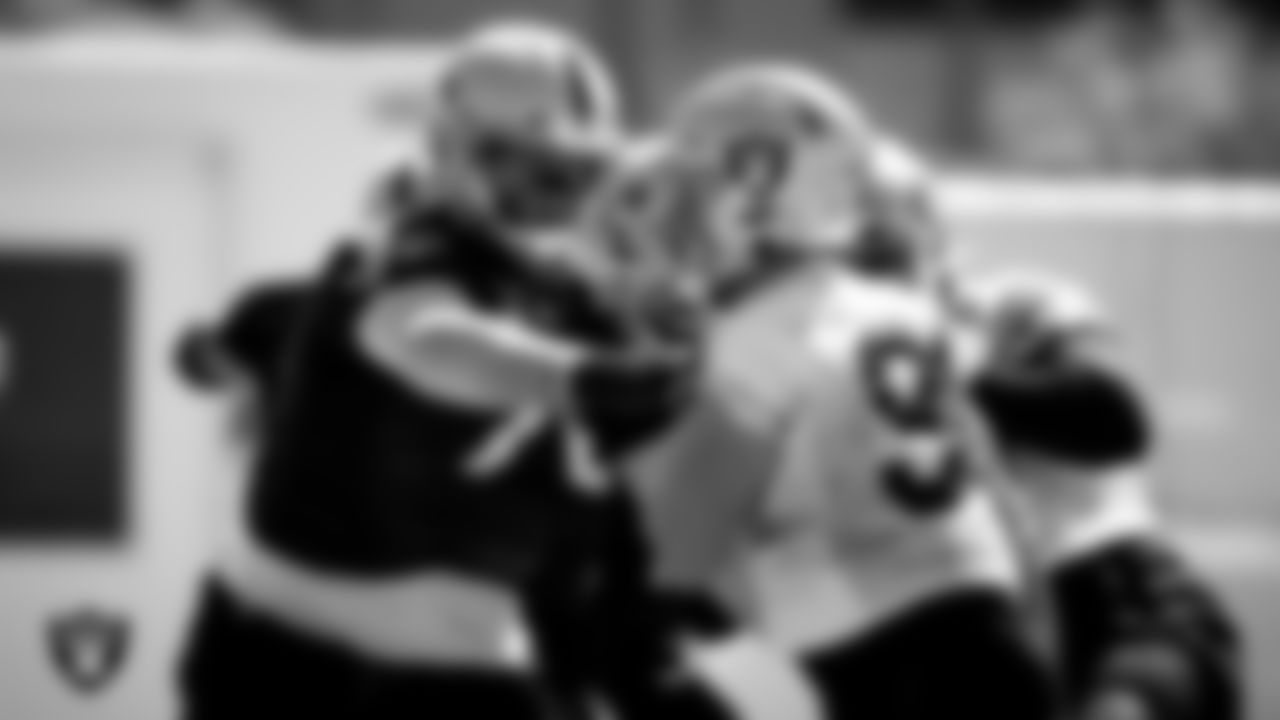 Las Vegas Raiders tackle Denzelle Good (71) during practice.
