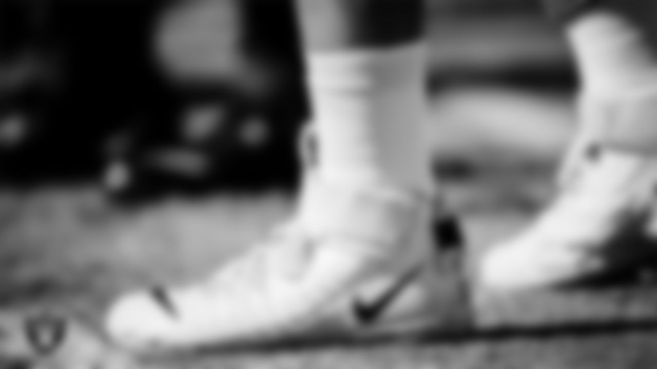 Las Vegas Raiders tackle Kolton Miller's (74) cleats during practice.
