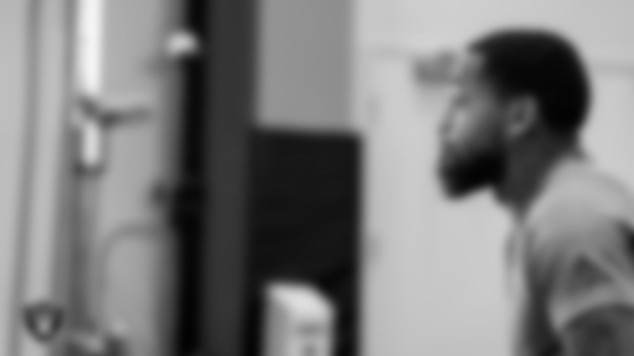 Las Vegas Raiders defensive back Jordan Brown (39) explores the equipment room after arriving for 2020 Training Camp.