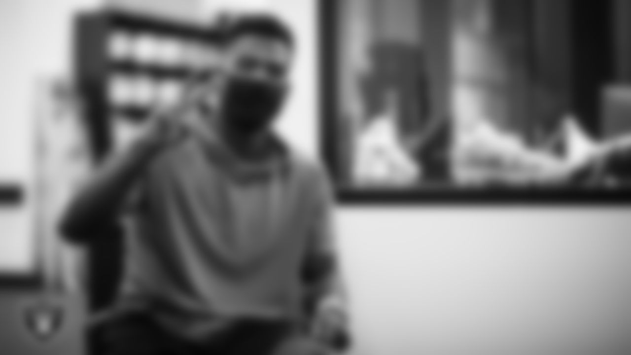 Las Vegas Raiders linebacker Javin White (53) sits down for an interview with Silver and Black Productions after arriving for 2020 Training Camp.