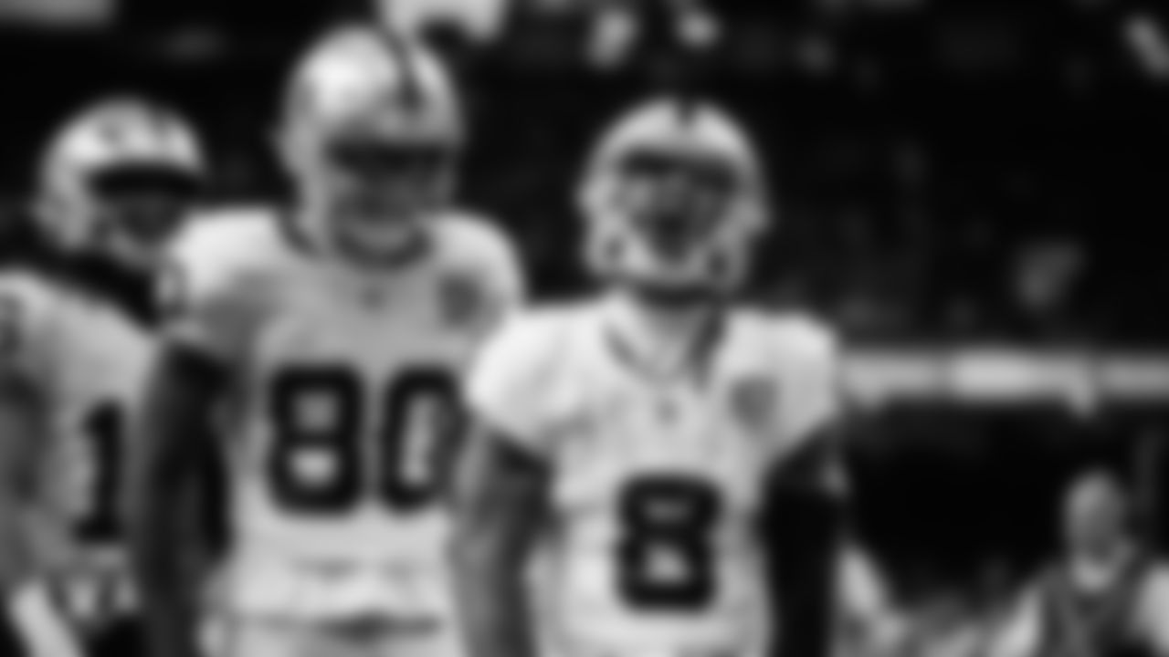 Las Vegas Raiders running back Ameer Abdullah (8) celebrates on the field during the regular season away game against the New Orleans Saints at Caesars Superdome.