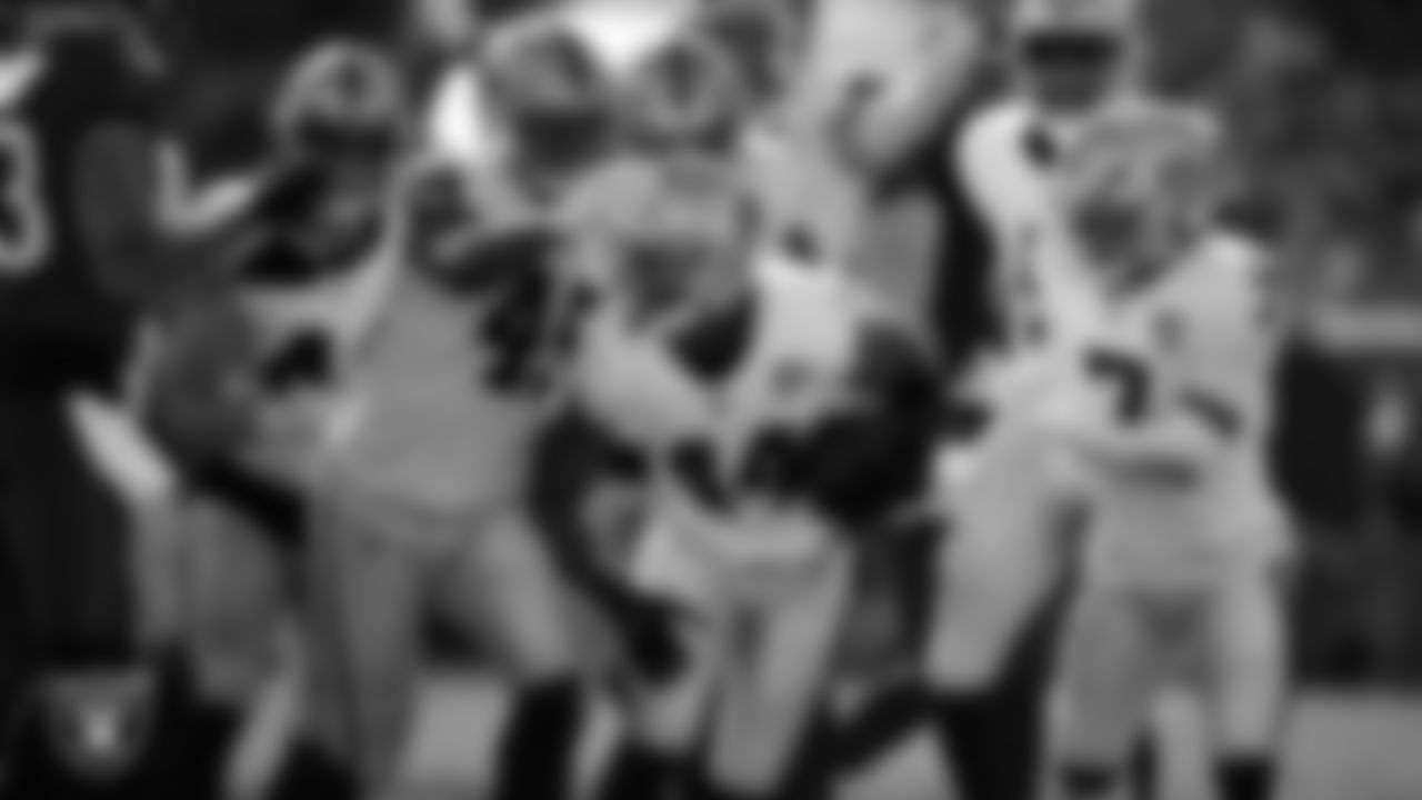 Las Vegas Raiders cornerback Nate Hobbs (39) celebrates with teammates after making an interception during the regular season away game against the Los Angeles Rams at SoFi Stadium.